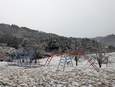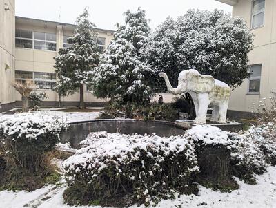 本日(12/19)の高森町は早朝からの雪で、子どもたちの登校時間には、一面の銀世界でした。今は、水分の多い雪(みぞれ)に変わりましたが、登校してすぐの子どもたちは、しばしの雪遊びを楽しみました。子どもたちに人気の「ぞうの池」にも氷が張って、本格的な冬の訪れを感じています。