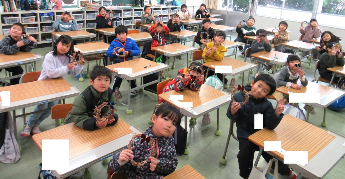 上の写真で紹介するのは、1年生がアサガオのツルで作ったリース飾りです。学校毎日水やりを重ね、夏休みには家庭でたくさん花を咲かせたアサガオ。枯れた後は、そのツルを大切に巻いてリースにしました。下の写真で紹介するのは、松ぼっくりで作った可愛らしいツリーです!素敵な作品は、冬休み前に持ち帰りました!きっと、家族を楽しませていることでしょう。