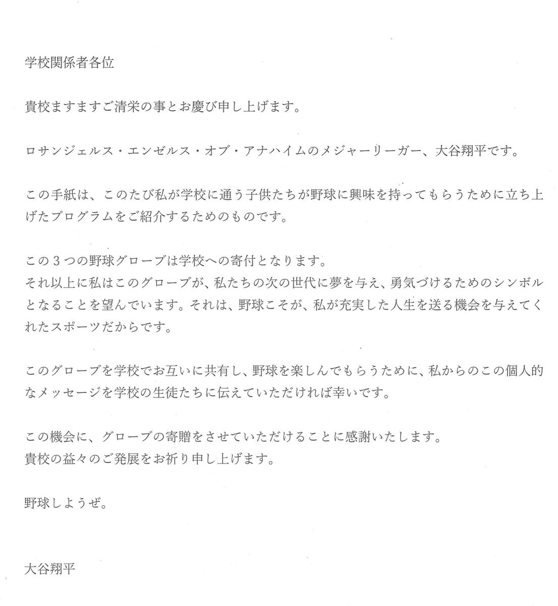 子どもたちの夢を応援し、子どもたちの健やかな成長を願い贈られたグローブ。私たち職員の願いと同じ思いを、遠く離れた地から願ってくださっている大谷翔平選手に、心からお礼を申し上げます。ありがとうございます!きっと、子どもたちにとって忘れられない贈り物になるよう、大切に使わせていただきます!そして、私たちも、遠く離れた地から大谷翔平選手の新天地でのさらなるご活躍を応援しています!