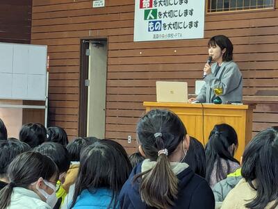講師は、株式会社 mother ship 代表取締役 水田結様(大分県中津市)。子どもたちへの水田様の自己紹介は、「子ども未来コーチの水田結です。」からスタートしました。「自分の人生を大切に生きてね!と伝えたくて仕事をしています。」と話される水田さんの言葉には、子どもたちの未来を心から応援されていることが伝わる、優しさが溢れていました。「あなたがあなたとして生まれて生きていくことが、とてもすばらしいこと。ちがいがあるからこそすばらしい。」「正解は、一人一人の心のなかにある。」「心の動きに間違いはない。」「自分のハートの声を聞こう。痛い、辛い、うれしい、これが好き。自分の声を聞くから、行動を選べる。」「未来は今日からつながっている。」これらの言葉は、これからの子どもたちの大きな支えになるに違いありません。