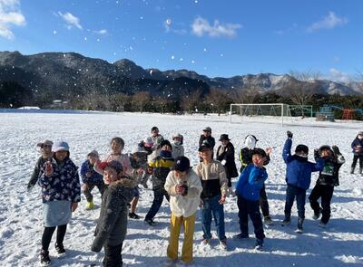 写真は、2年生の子どもたちが雪遊びをする様子です!一面雪の運動場は、子どもたちにとって最高の遊び場です!さらさらの雪をギュギュっと握って雪合戦の開始です!昨日は、子どもたちのいない学校でさみしい思いをしましたが、今日は、子どもたちのキラキラの笑顔を運んでくれた雪の贈り物に感謝した一日でした。