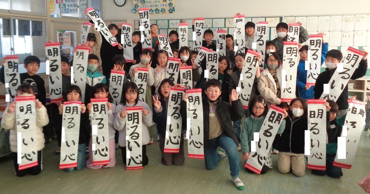 写真は、3年生の書初めの作品です。今年から習字のが学習を始めた子どもたちが、誇らしげに作品を手にしています。一つの教室で学ぶ仲の良い子どもたち。この書のように、『明るい心』を大切に、たくさんのことに支え合い励まし合いながらチャレンジする年にしてほしいと思います!