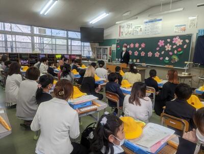 3/30(木)、本年度をもって退職・転任される6名の先生方の退任式を行いました。多くの子どもたちと保護者の皆様、卒業生に見守られ、先生方は、子どもたちへ最後のお話をされました。38年間の教職生活を終え、退職される先生からは、たくさん持った夢の中から先生の仕事を選び、夢を叶えたことの幸せをお話しいただきました。子どもたちから先生方への手紙の中には、「先生に教わったことで、その教科を好きになりました。」と、感謝の気持ちが溢れる言葉が綴られていました。