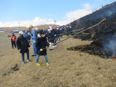 2/21(火)町古閑牧野にて、阿蘇青少年交流の家のスタッフの方や、野焼きボランティアの方のご指導のもと、4年生が野焼き体験を行いました。