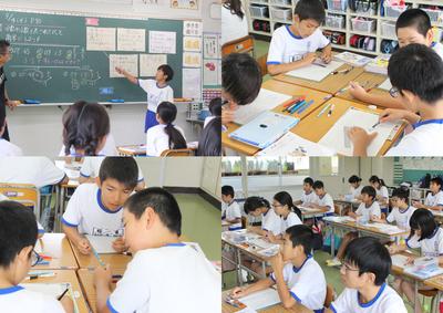 写真は、今週の6年生教室の様子です。算数の時間に「分数や小数で表された比を簡単にしよう」をめあてに学習に取り組んでいます。