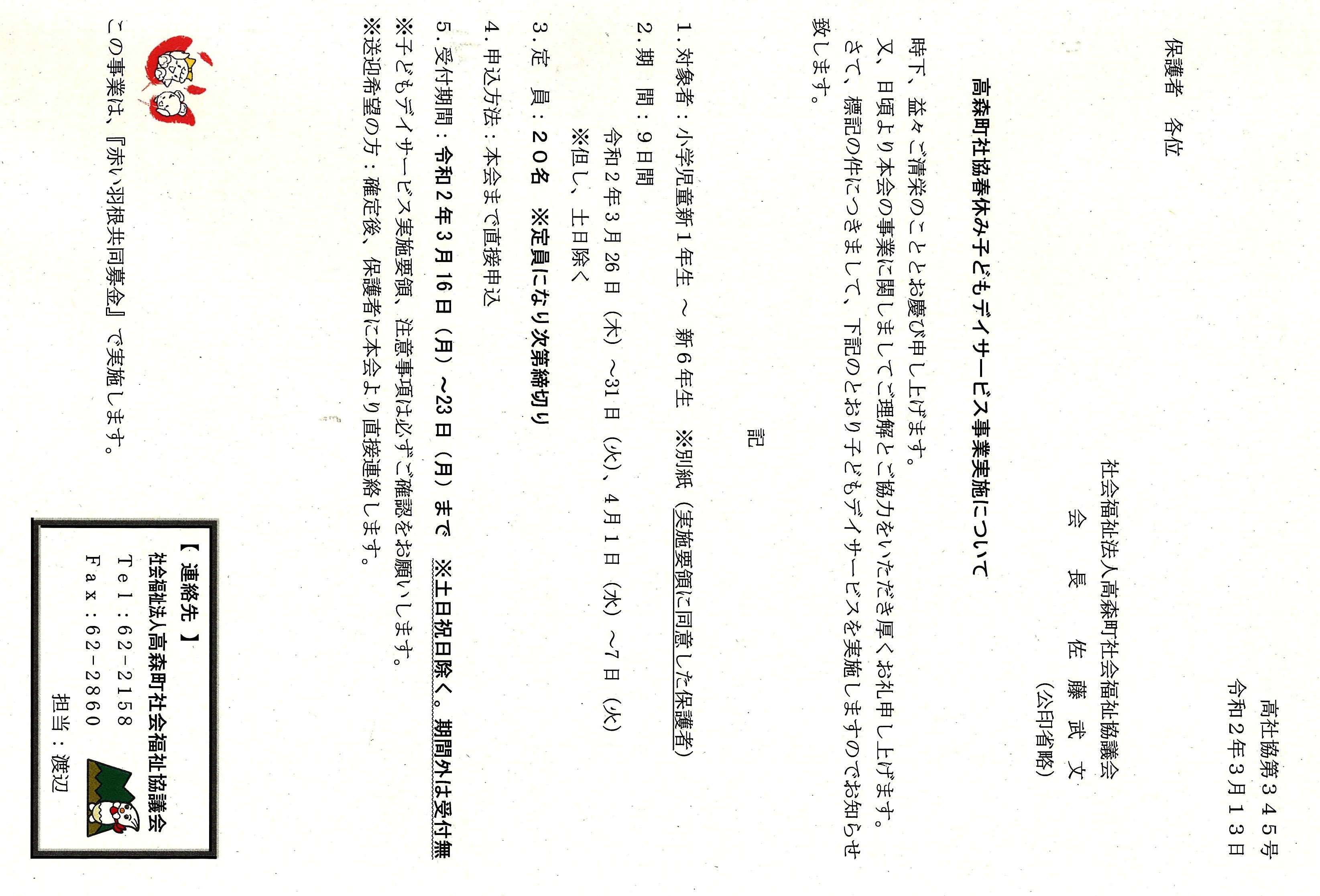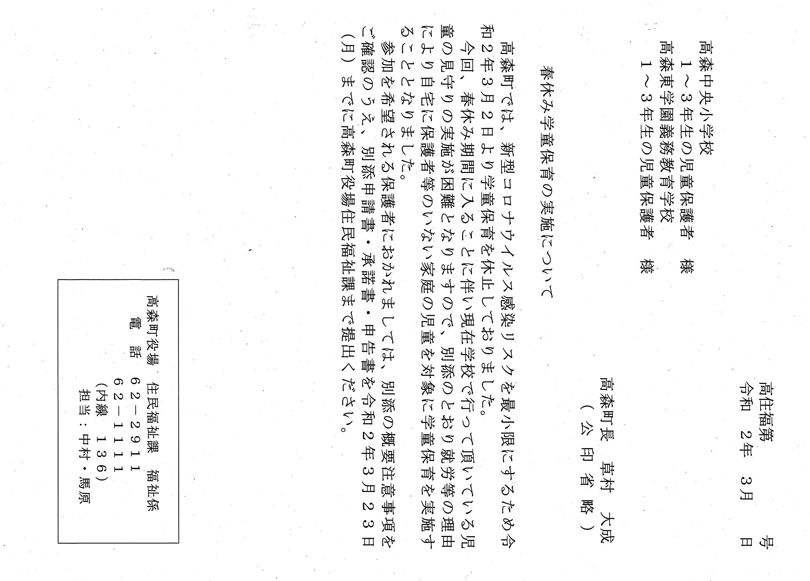 以下に、高森町役場 住民福祉課 福祉係、高森町社会福祉協議会からのお知らせ文書を添付しております。必ず、ご確認いただきますようにお願いいたします。詳しくは、3/16(月)に、子どもさんが持ち帰ります文書でご確認ください。