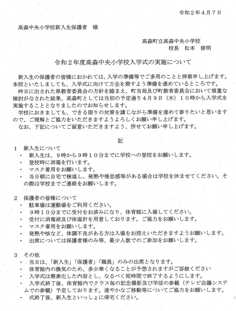 令和元年度 高森中央小学校 始業式・入学式等の実施についてお知らせいたします。