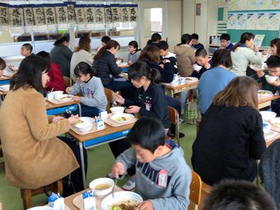 写真は、本日(2/10)、6年生の給食の様子です。給食試食会を設定し、保護者の皆様にお越しいただきました。本校では、1・3・6年生で行っている給食試食会ですが、6年生にとっては、今回が保護者の方と一緒に給食をいただく最後の機会でした。きっと、保護者の皆様は、これまでの試食会を思い起こされ、食べる量が増え、たくましくなったことや好き嫌いが少なくなり、頼もしくなったこと、体が大きくなり、教室が狭く感じられること等に特別な思いをもたれたのではないかと思います。