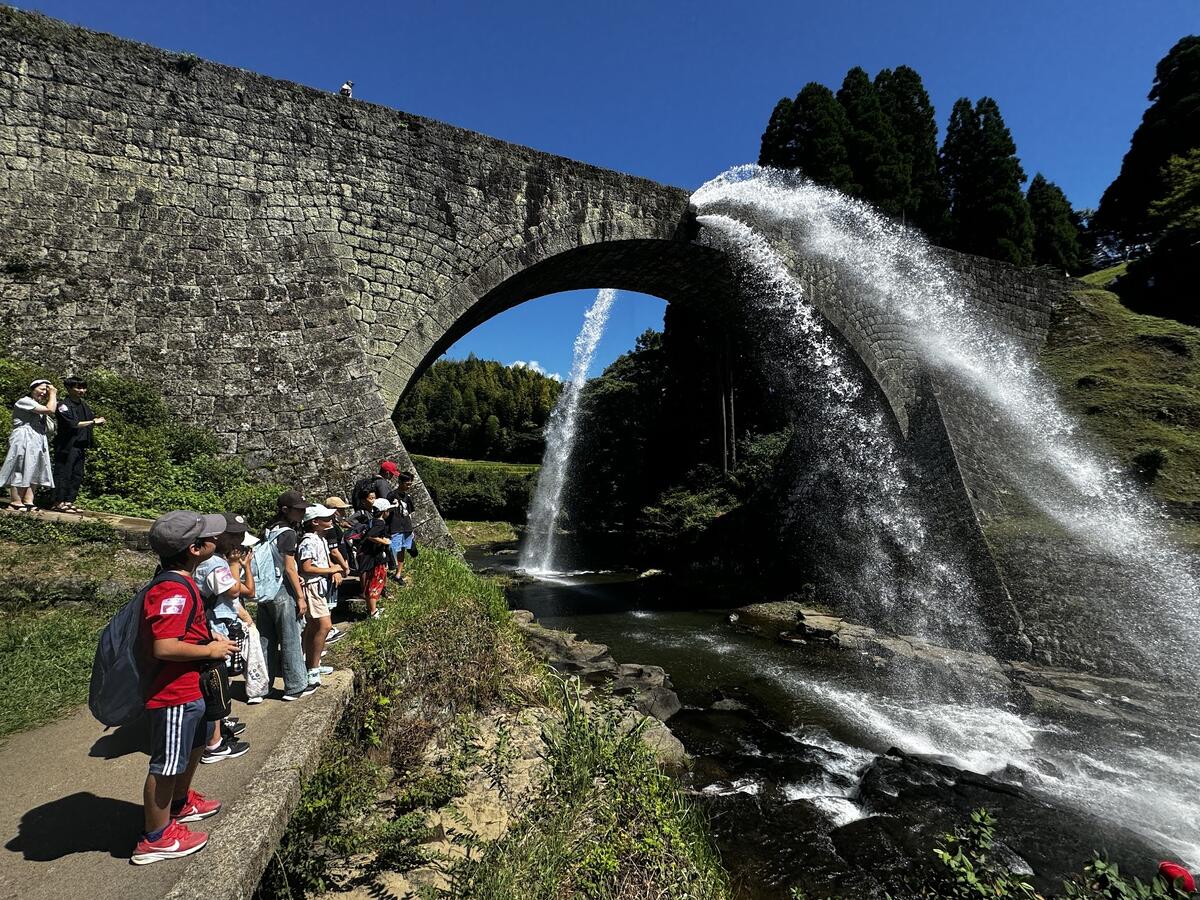 円形分水を見学した後は、国宝に指定された『通潤橋』を訪れました。『通潤橋』は、嘉永7年に四方を河川に囲まれた白糸台地に農業用水を送るため、矢部の布田保之助によって作られた世界最大級の石造アーチ水路橋であり、唯一放水ができる橋です。偉大な功績に触れた4年生の子どもたち!!何を学び、何を感じ、これから、どんな学びにつなげていくのでしょう!!もうすぐ、学校に戻ってくる4年生に会うのが楽しみです!!