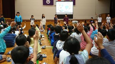 甲斐校長先生からは、「今日はクイズです!」と、1学期中に校長講話で話された内容を問いかけられました。すると、子どもたちから次々に校長先生が話されたことが出され、職員からも思わず歓声が上がりました。校長先生からは、本校のテーマ『挑む』が達成された一学期だったと伝えられ、子どもたちは本当に嬉しそうな表情を見せました。