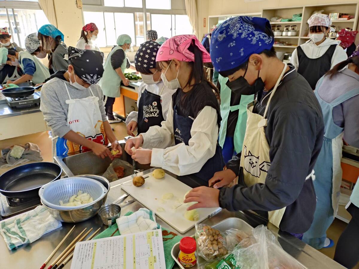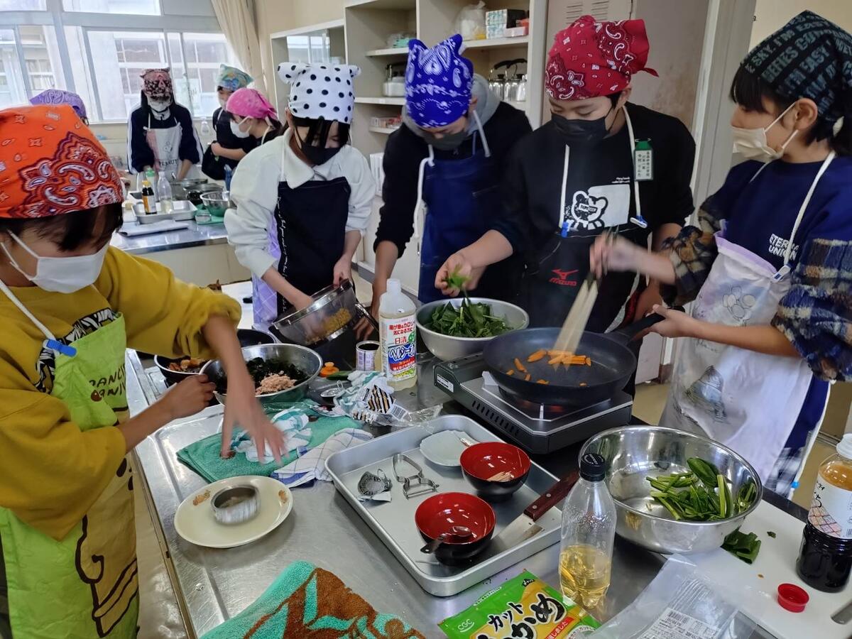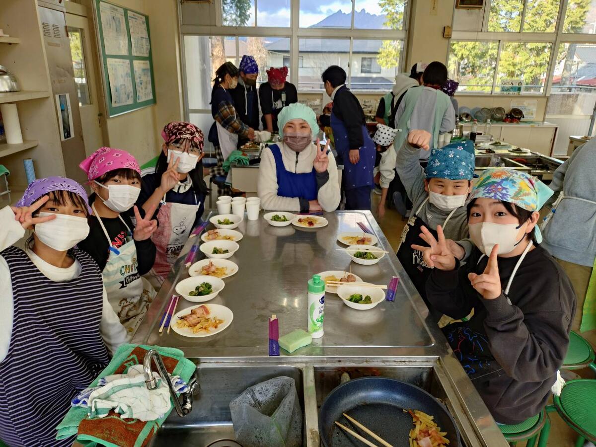 写真は、本日(12/19)5・6校時の6年生の様子です!家庭科の学習で、1食分の献立を立てて調理に取り組んでいます!!6班に分かれた6年生の子どもたち、各班ごとに主催と副菜の2品を考えて、美味しく作り上げることができました!校内には、香ばしい香りが漂い、家庭科室周辺には、6年生の朗らかな声が響いていました!この日を楽しみにしていた子どもたち、思ったより増えたわかめに笑顔になったり、ほうれん草をゆでる鍋の大きさに迷ったり、うずらの卵ををまくベーコンの長さを真剣に考えたり!子どもたちにとって、本当に楽しく学びの大きい時間になりました!冬休みには、家族のためにぜひ、料理にチャレンジしてね!!