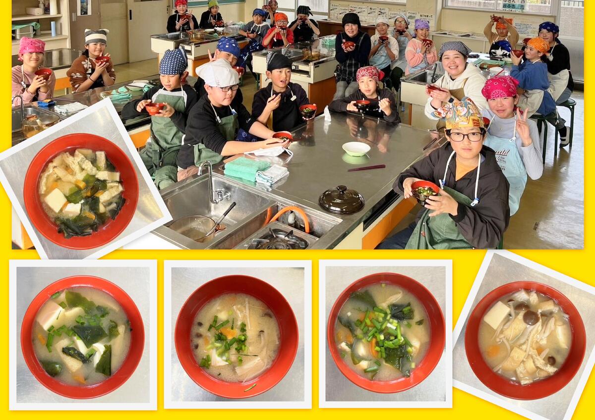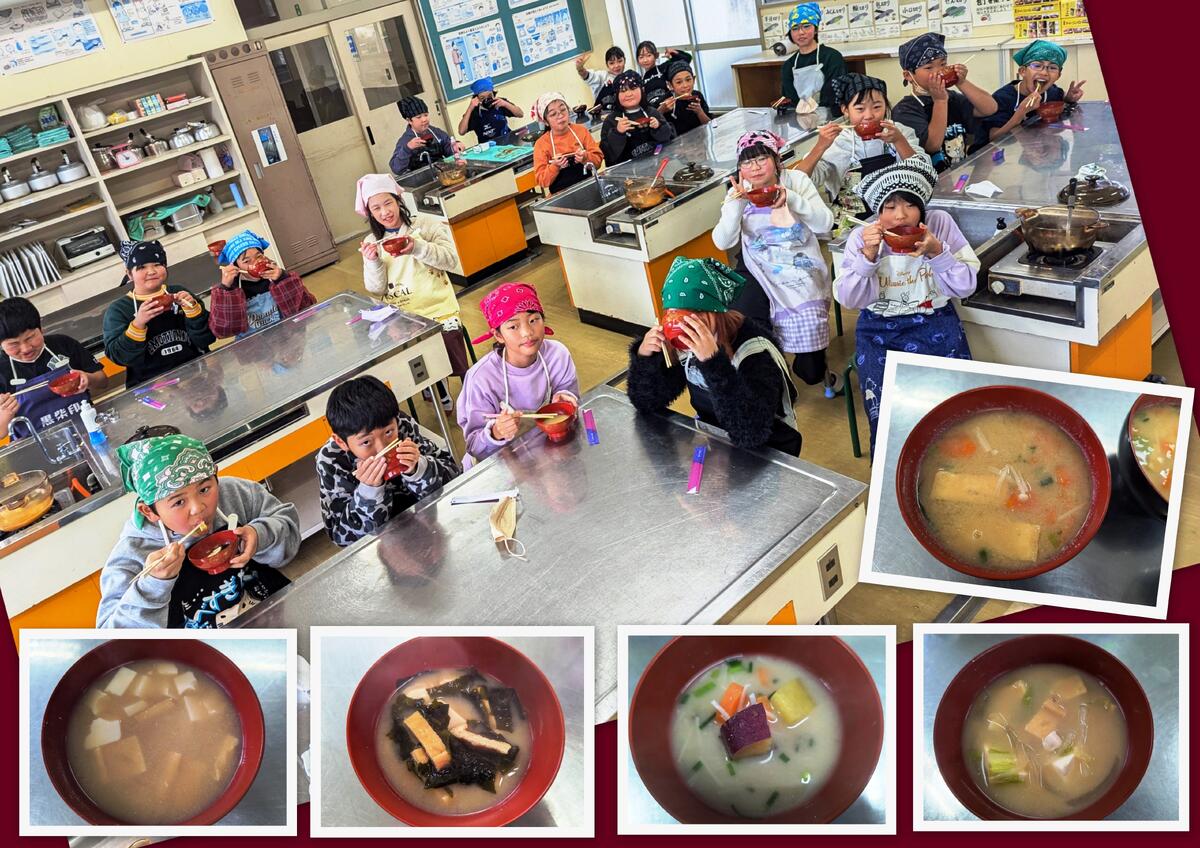 写真は、過日(12/18)5・6校時と本日(12/20)3・4校時の5年生の様子です!!家庭科の時間に、みそ汁づくりに取り組みました。平安時代の絵巻物には、すでに、ご飯と汁ものが描かれていたそうです。みそ汁であったかは定かではありませんが、大豆から作られるみそは、古くから調味料として親しまれてきた、和食には欠かせない食品です。そのみそを使った「みそ汁」。これさえ作ることができれば、一人で生活する日が来ても、バランスの取れた食事を支えることができるはずです!今回の食材『みそ』は、高森町の老舗で作られたおいしい味噌です!いりこでとった出汁と美味しい味噌の組み合わせ!どんな実を入れても、最高においしく仕上がりました!!5年生の調理実習、大成功!!さあ、冬休みには、ぜひ、家族の味を教わったり調理実習の味を再現したりと、みそ汁づくりにチャレンジしてほしいです!!