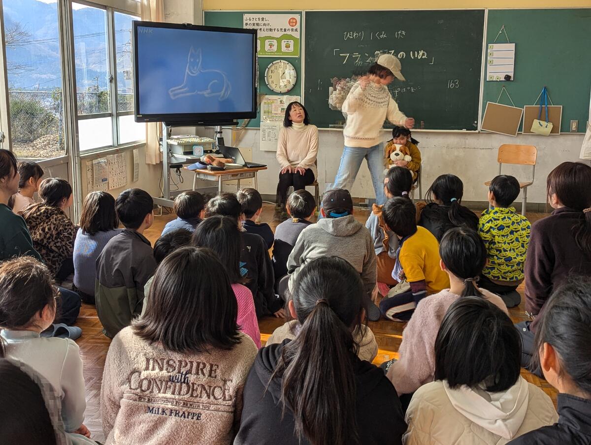 写真は、本日(12/20)昼休みの様子です!ひまわり1組に集まったのは、3年生と5年生の子どもたち!!本日公演の『フランダースの犬』を鑑賞にやってきたのです!!演じるのは、ひまわり1組の子どもたち!!これまでの練習の成果を発揮して、集まった子どもたちに感動のお話を伝えることができました!!心のこもったセリフからは、お話を何度も何度も聞き、お話に心を寄せたことが伝わります。そして、少しは恥ずかしそうな表情からは、大切な友達にこの公演を見せる日を楽しみにしてくれていたことが伝わります。真剣に見入る子どもたちには、きっと、そんなこれまでの積み重ねや思いが伝わっていたに違いありません!!素敵な時間でした!!