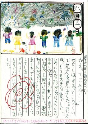 夏休み明けの子どもたちが、溢れんばかりの夏の思い出を語ってくれます。その一端ではありますが、ホームページをご覧の皆様にも、おすそ分けいたします!一回目は、1年生の絵日記をお届けします!