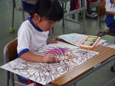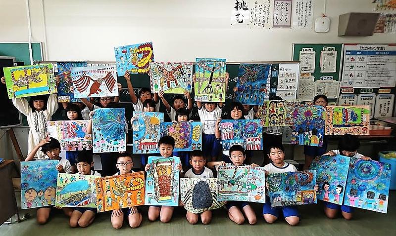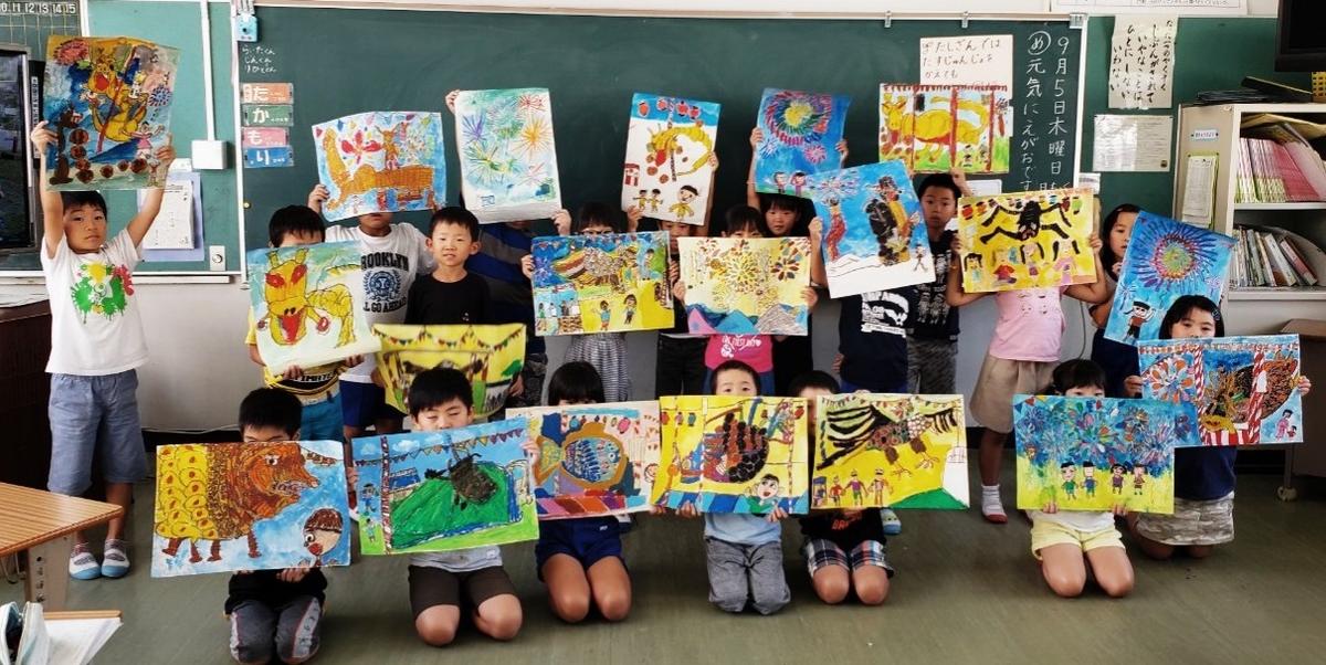夏休み明け、高森町の小学生全員が取り組むのが、「熊日ちびっ子スケッチ展」です。高森町に250年続く伝統の祭り『風鎮祭』や『夏の思い出』を描きます。写真は、一年生の子どもたちが祭りで見た「花火」や日用雑貨で作られた「やま(つくりもん)」等を描く様子です。入学したときには新品だったクレパスもしっかり使い込まれて、活き活きと力強い作品が描かれています!