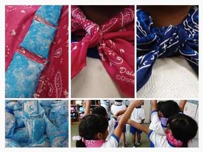9/3(火)、本日も残暑厳しい中での運動会練習となりました。しかし、本校には子どもたちの熱くなった体をひんやり冷やす「人気の暑さ対策」があります。給食前の時間に、保健委員会の子どもたちが各教室に運んできてくれる保冷剤です。保護者の皆様にご用意いただいたハンカチやバンダナにくるっと包んで嬉しそうに首に巻きます。昼休み中も保冷剤に包まれて、快適に過ごすことができます。使用後は、養護教諭の先生が衛生面にも最善の配慮をされ、また明日の練習のために冷凍庫へ。子どもたちが元気いっぱい練習に取り組むことができるように応援しています!