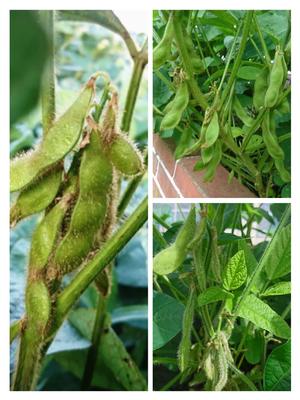 3年生の子どもたちが、登校後真っ先にのぞくのは、花壇に植えた大豆です。つい先日まで紫色のかわいらしい花をつけていましたが、いつの間にか実をつけ、大きく成長中です。花壇に植えたのは、高森ふるさと学の学習にご協力いただいている丸美屋さんよりご提供いただいた「フクユタカ」(写真右下)と「黒大豆」(写真右上)です。品種によって、少しずつ色や実のつきかたが違うことにも気づきました!