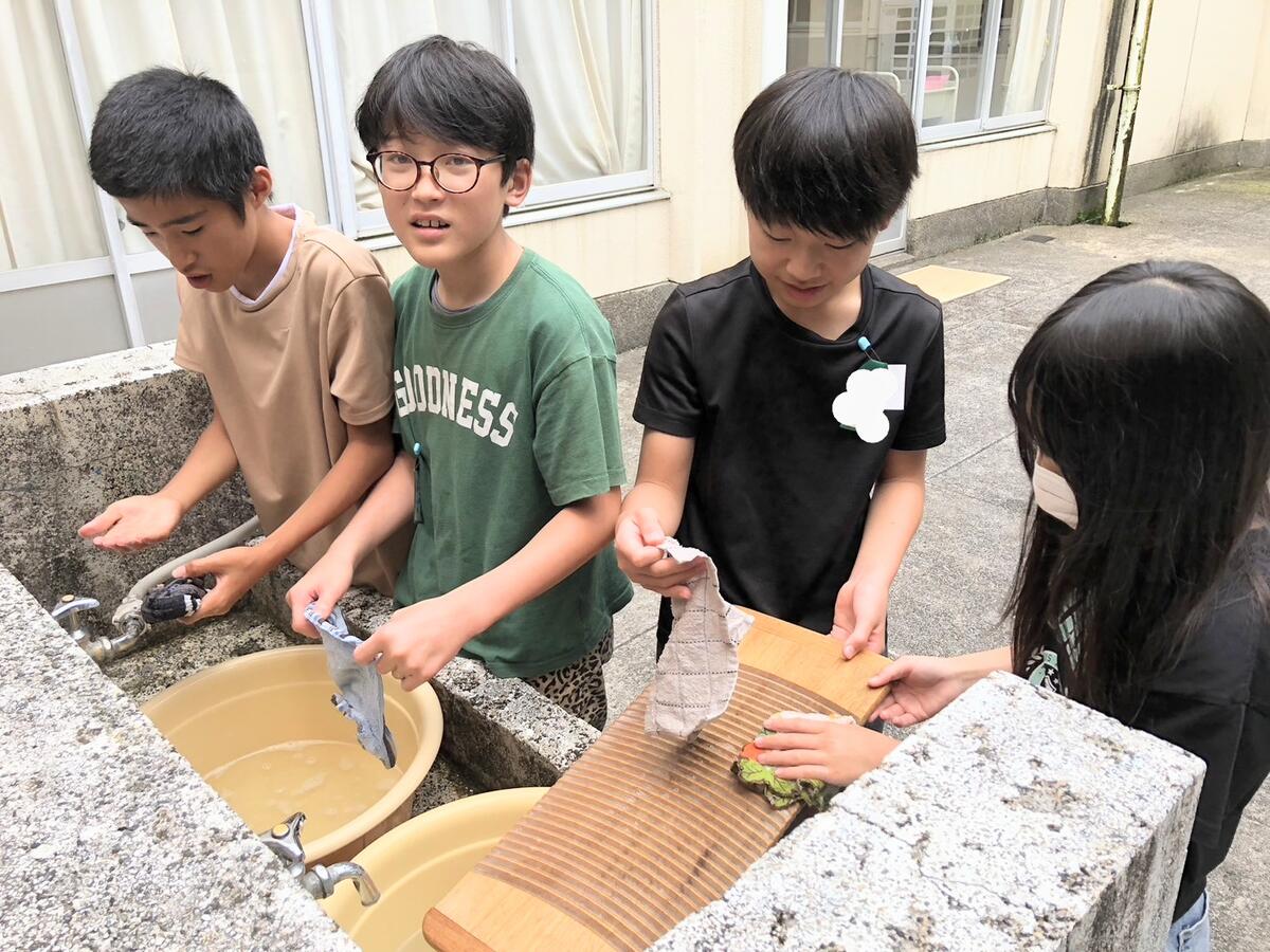 写真は、本日(7/18)3校時の6年生の様子です!!家庭科の時間に、洗濯板を使って、自分のハンカチをお洗濯!!手洗いで洗濯する経験の少なくなった子どもたちにとって、とても楽しい時間になったようです!!よく汚れが落ちることを実感した子どもたち!!これから、スポーツで汚した落ちにくい汚れや優しく手洗いしたいお気に入りの洋服は、きっと、今日の学びを活かしてきれいにしてくれることでしょう。