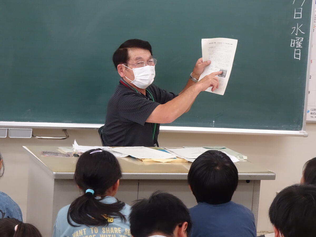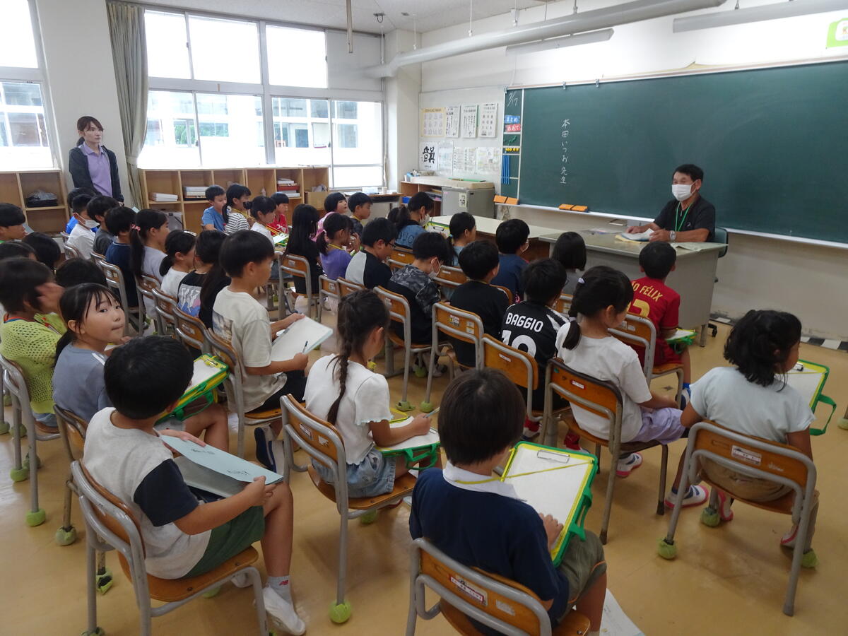写真は、本日(7/18)3校時の3年生の様子です。高森町で、井上みさをさんによって発見されたみさを大豆を守り、受け継いでおられる「みさを大豆保存会」より、本田様をお迎えして、お話を聞いています。井上みさをさんのこと、保存会の活動の様子等、丁寧にお話をしていただいたことで、子どもたちの関心は高まり、たくさんの質問をすることができました。過日(7/3)に植えた、学級園のみさを大豆も、順調に芽を出しています。このみさを大豆のおいしさは、給食を通して知っています!子どもたちの植えたみさを大豆を収穫して、またまたそのおいしさに驚く日がとても楽しみです!!