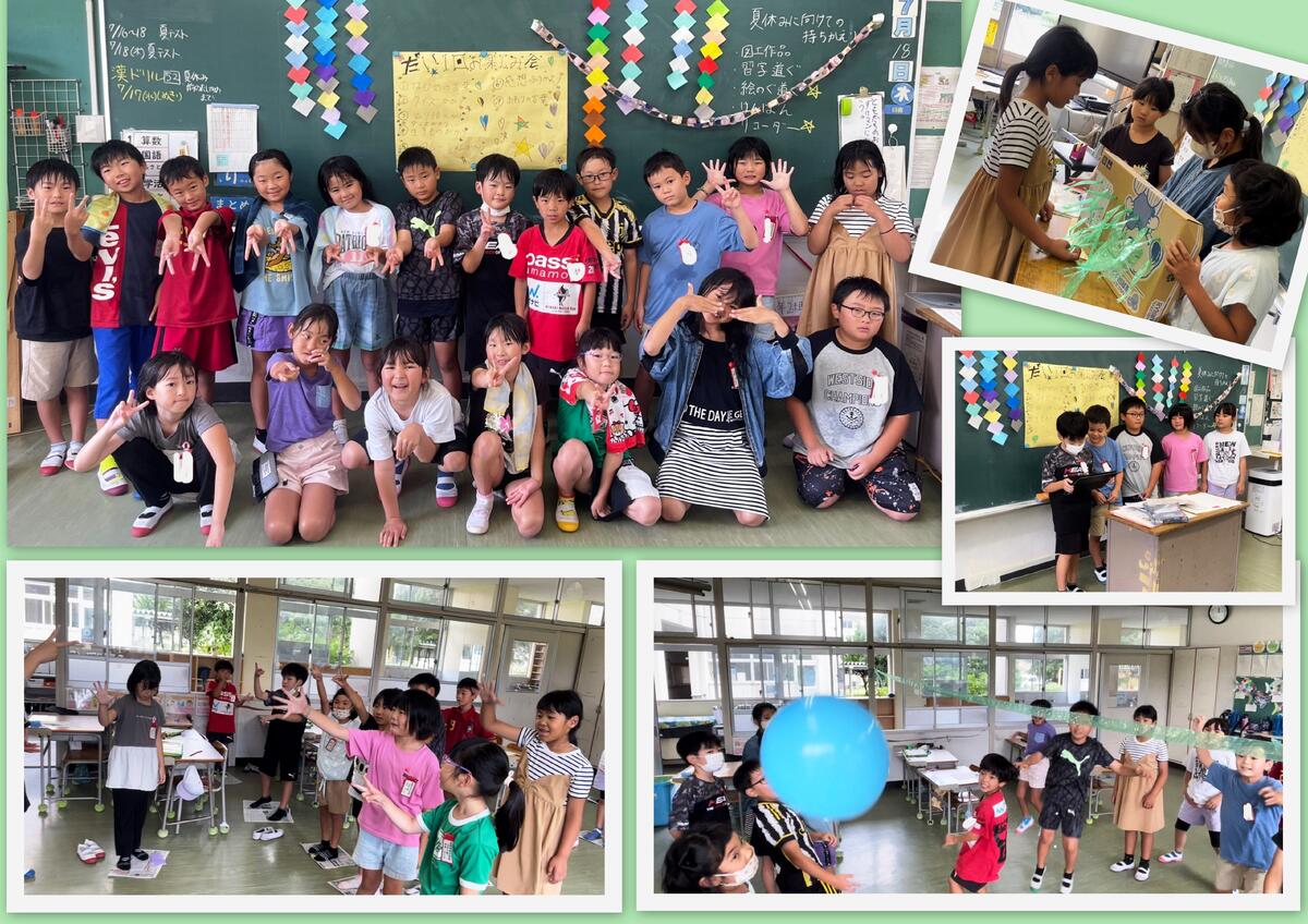 写真は、本日(7/18)5校時の1年生と6年生の様子です!6年生が、入学してから学校生活をがんばっている1年生を楽しませたいと企画した『思い出を作ろう会』です。本当に楽しそうに遊びに参加する1年生の様子を見て、6年生も嬉しそうです!明日で1学期前半が終わりますが、これまでに6年生は、朝の時間や給食の時間、昼休みにしっかりと1年生のお世話をしてきました。1年生にとって、本当に頼りになる存在なのです。本当に微笑ましく、忘れられない思い出いっぱいの一時間になりました!!