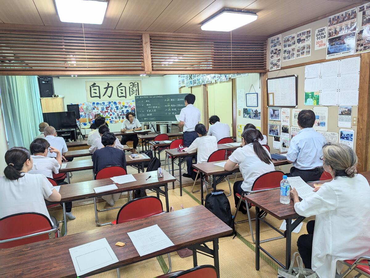 写真は、本日(7/31)午後の先生たちの様子です。『憩いの家』を会場に、全職員で勉強会を行っています。高森町のみなさんが、仲よく幸せに暮らせるようにと活動されている中川誠雄さんのお話を聞いたり、先生たちが自分のことや思いを綴った『人権レポート』について語り合ったりしました。毎年、夏に行うこの勉強会で、先生たちはもっともっと仲良くなり、一緒に仕事ができることを幸せに思うようになるんです。