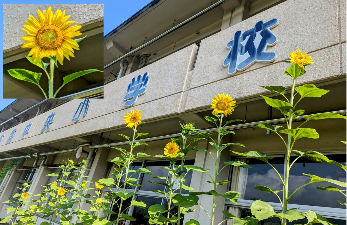 3年生のみなさん、みなさんが大切に種を植えて、育ててくれていたひまわりが、きれいな花を咲かせています!!本日(8/7)、ひまわりの花を見上げながら、写真に撮りました!!2階にまで届きそうなくらい、まっすぐに太陽に向かって大きく大きくのびのび育っています!!