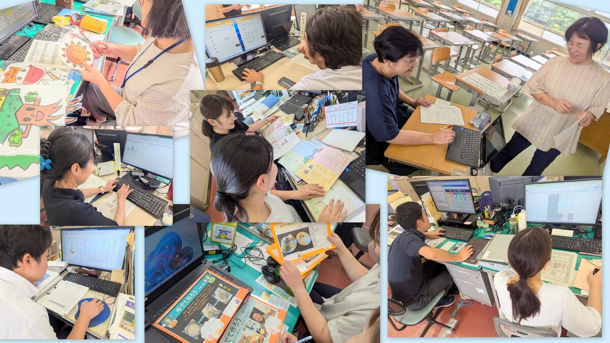 1年生担任の先生と、3年生担任の先生は、道徳の教科書を開いて何か相談中!2年生の先生は、席替えの案を検討中!4年生の先生は、1学期後半の時間割を考えたり、授業で使う思考ツールを試してみたり!5年生の先生は、夏休み中に子どもたちが提出した家庭科の宿題の調理スライドをプリントアウトしてコメントを書き込んでいます!6年生の先生は、算数の授業について話し合い中!!みんな、明日から始まる1学期後半を楽しみにしながらお仕事中です!!