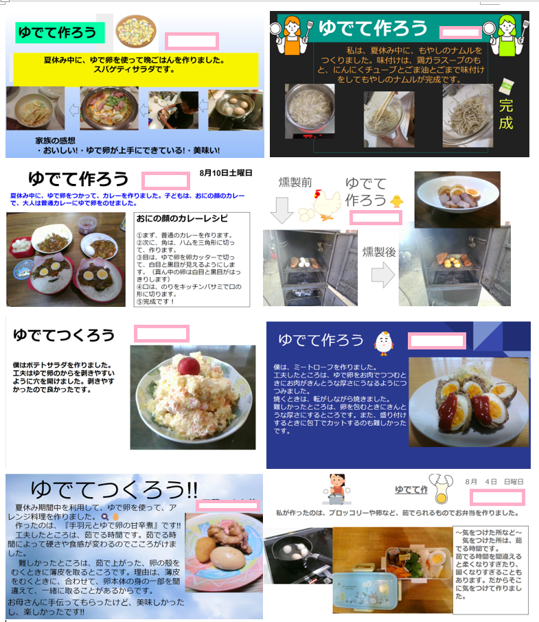 今週末から、集団宿泊教室に参加することを楽しみにしている5年生!!水俣環境学習にも真剣に学ぶ姿を見せています。さて、今年度から家庭科の学習がスタートし、1学期前半には調理実習も行った子どもたち!!その学びを活かして、夏休みには『ゆでて作ろう!!』にチャレンジしました!!保護者の皆様のご協力、ありがとうございました!!