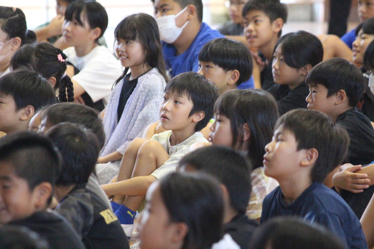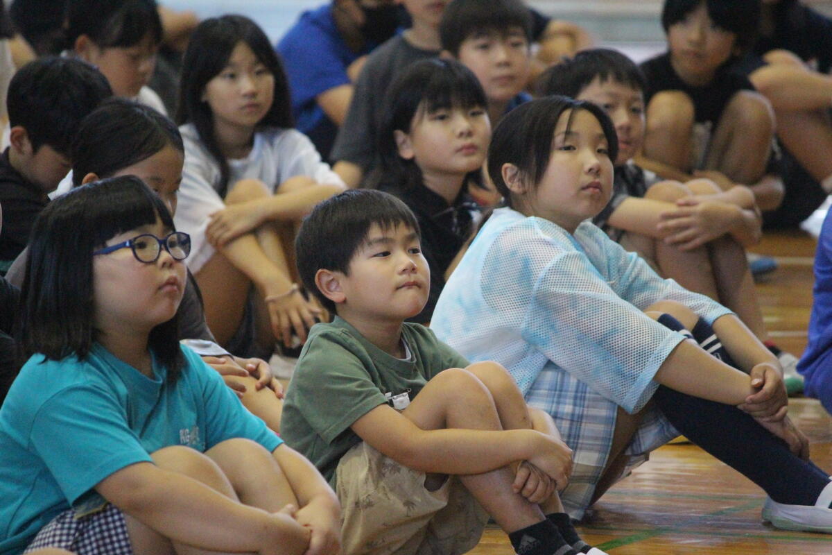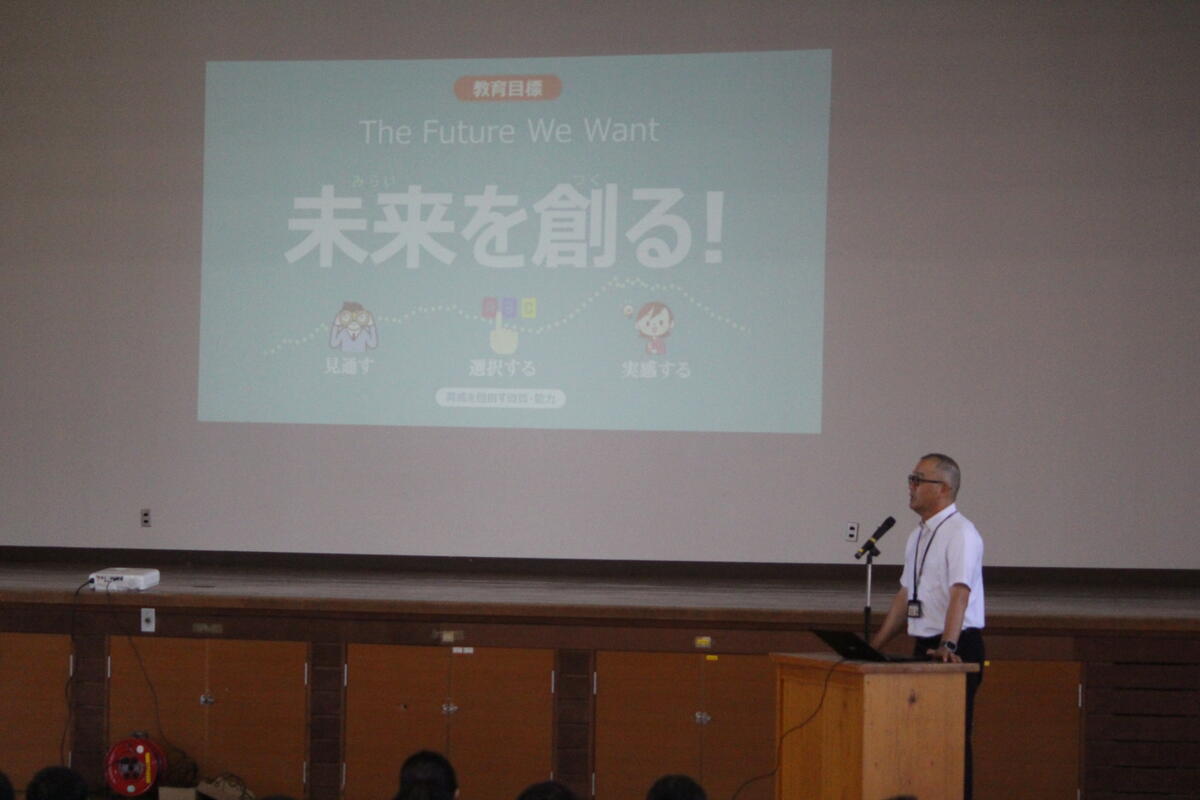写真は、本日(8/28)1校時の様子です!!子どもたちは、夏休み明け集会での校長先生の話に真剣に聞き入っています!!夏休みを終えて登校した子どもたちの表情は凛々しく、この夏に心も体も大きく成長したように感じられてうれしくなりました!校長先生からは、本校の教育目標『未来を創る』のもと、「自分らしく」をテーマにお話しされました。東京海洋大学の名誉博士「さかなクン」の著書『一魚一会』から、みんなが生きていける環境づくりに取り組まれている「さかなクン」が、失敗をしながらも、自分の「好き」という気持ちを大切にして、自分らしく生きてきたことで、目標を達成されたエピソードを紹介されました。そして、最後に、校長先生から子供たちへ!!「夢中になって探究してほしい!自分を信じて学んでほしい!」と、メッセージを送られました!!