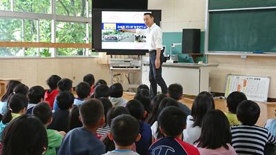 5/20(月)、高森町発祥の「みさを大豆」の校内継承式後、3年生の子どもたちは、大豆を材料に多くの食品を生産販売されている丸美屋の福永さんより講話をいただきました。食い入るように講話に聞き入った子どもたちは、大豆が栄養豊富な食材であること、地産地消することには多くのよさがあること、農業に携わることの苦労と喜び等、たくさんのことをを教えていただきました。これから「みさを大豆」を植え、成長を見守る子どもたちにとって大きな学びとなりました。