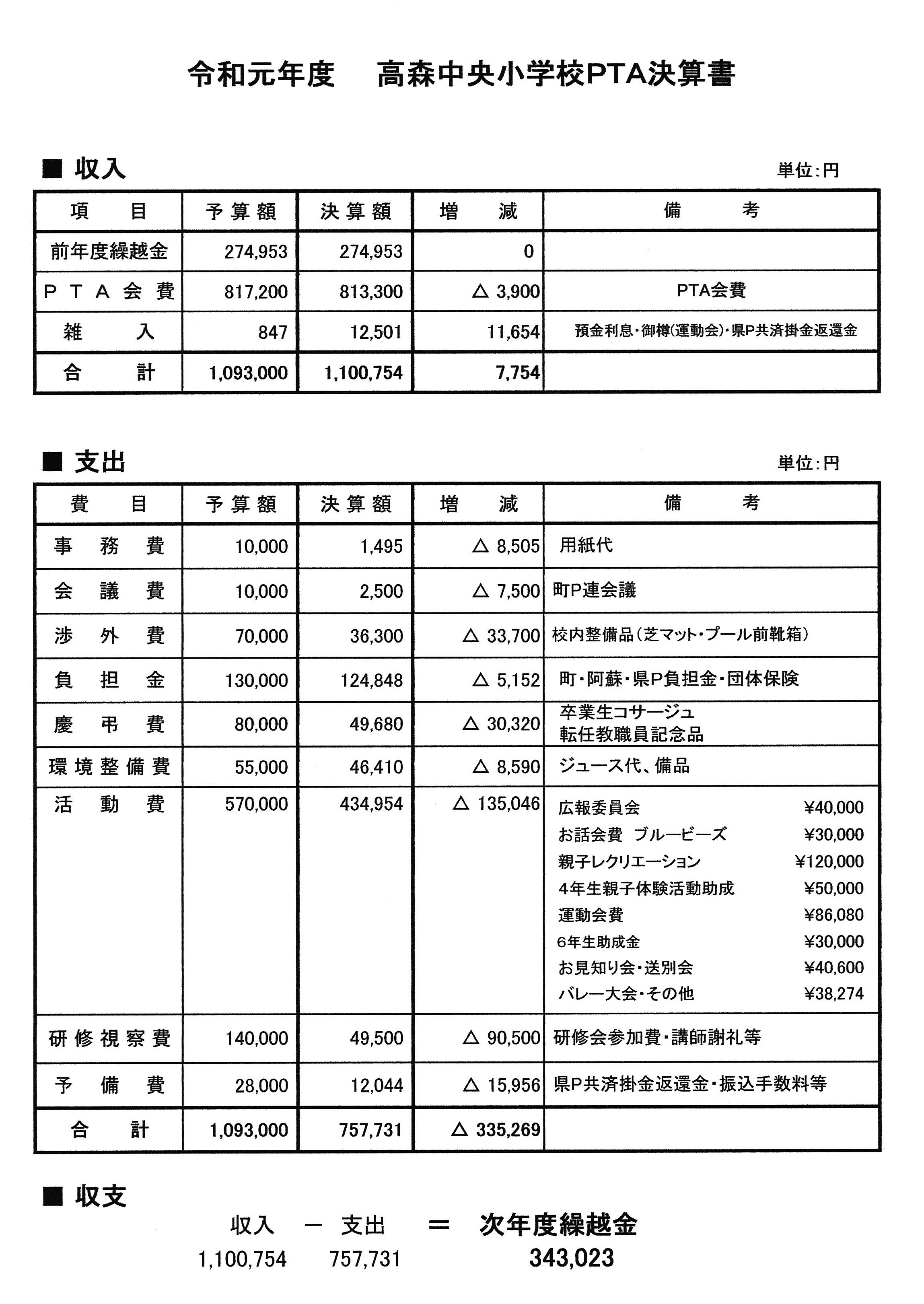 令和2年度 高森中央小学校PTA予算について 4月に行う予定でしたPTA総会でご検討、ご承認いただく予定にしておりました「令和2年度 高森中央小学校PTA予算(案)」についてお知らせいたします。以下の文書をご覧いただき、ご意見等ありましたら、5月末日までに執行委員を通してPTA役員までご連絡いただきますようにお願いいたします。併せて、「令和元年度 高森中央小学校PTA決算書」についてもご確認いただきますようにお願いいたします。 令和元年度 高森中央小学校PTA決算書.jpg