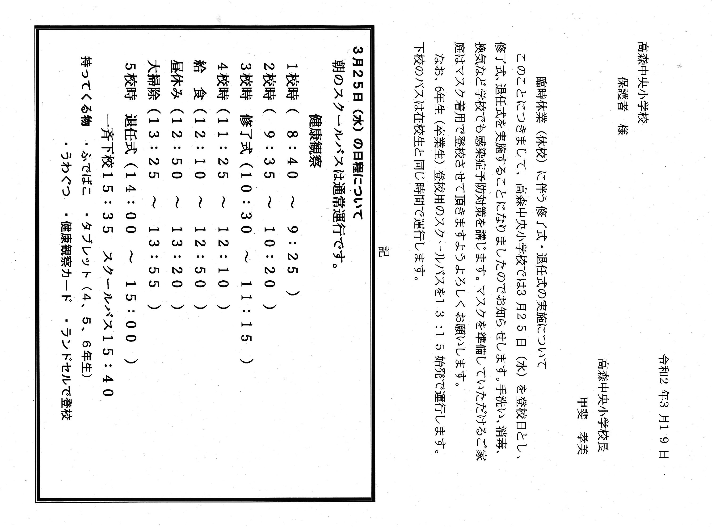 3月24日(火) 3/25(水)は、1~5年生の修了式と令和元年度の退任式を行います。 児童の皆さん、長い臨時休校中は、元気に過ごしていますか? 明日が、本年度最後の登校日となります。先生たちは、皆さんのことを学校で待っています。元気に登校してください! 日程等については、以下を再度ご確認ください。 臨時休業(休校)に伴う修了式・退任式の実施について.jpg
