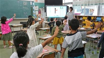 本日学習していたのは、『上』の文字。子どもたちが、教科書の上巻・下巻という言葉に興味を持ったのを機会に取り組まれた本日の学習です!電子黒板の機能と、黒板を有効に活用して、子どもたちの既存の知識を引き出しながら興味を高め、書き順を学ぶ活動では、立ち上がって体中で学ぶ姿が見られました!