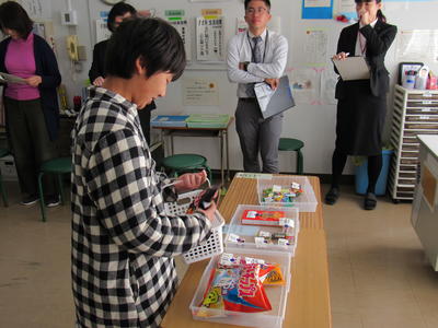 11/6(水)3校時は、本年度8回目の研究授業でした。本日の研究授業は、ひまわり1組生活単元学習『買い物名人になろう』でした。商品の合計額を見て、お金を出したり、店員さんと必要な会話をしたりする活動に、教材・教具の工夫のもとで取り組みました。買い手や売り手が使用する言葉を考えて実際に使い、購入した商品を紹介する活動は、語彙を増やし、言葉の力やコミュニケーションを育成させるものでした。また、教師と子どもの確かな信頼関係の上での充実した学びを感じるものでした。日頃の学級経営と授業の学びの繋がりを、強く感じた充実した研修の時間となりました!