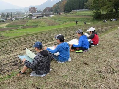 高森町は、秋も深まり美しい季節を迎えました!本日(11/11)、5年生は、高森1番地にある棚田で、スケッチを行いました。この『棚田スケッチ大会』は、津留地区多面的機能支払活動組織の皆様にお世話いただいて、毎年5年生を対象に行っているものです。故郷に誇りを持てる子どもたちの育成を目的に行われているこの大会を通して、子どもたちは阿蘇の美しい自然の中で暮らす喜びと、それを維持・管理してくださる人々への感謝の心を持つ素晴らしい機会になっています。本日も、子どもたちは、美しい景色と気持ちのよい空気に包まれて、心を込めて絵を描くことができました。