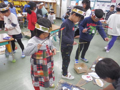 写真は、11/27(水)2校時の様子です。完成したおもちゃで『秋のおもちゃ大会』を開き、2年生を招待しました。入学してすぐの学校探検に始まり、いつも傍で1年生を応援してくれたのは頼りになる2年生の子どもたちでした。そんな頼りになる2年生にお礼がしたいと1年生が企画したものでした。もちろん、『秋のおもちゃ大会』は大成功!2年生はとても喜び、とても楽しんでくれました!「2年生が喜んでくれて嬉しかったです!」そんな1年生の言葉に、大きな成長を感じました!