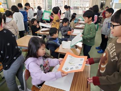 写真は、11/29(金)本日の2年生の様子です。国語の時間に書いた『しかけカードの作り方』と、生活の時間に書いた『お礼状』を持って、1年生教室を訪ねたようです!
