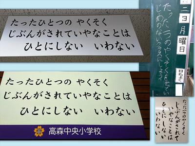 過日(11/27)、高森中学校で行われた高森町人権教育授業研究会で、本校の卒業生が学習シートに『たった一つのやくそく』について書いていたことが、職員の中で話題になりました。高森中央小学校を離れても、大切にし続けるものが『たった一つのやくそく』なのだと実感しました。