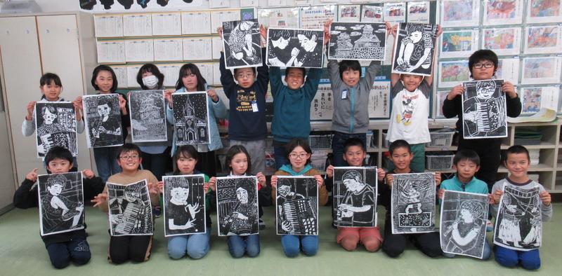 全校で取り組んでいます版画の作品が続々と完成しています!本日は、1年生の作品をお届けいたします!「楽しかったことを版画にあらわそう!」をめあてに初めて取り組んだ紙版画です!完成した版画を見て、「おー!真っ黒になった!」とかわいらしい歓声をあげました!表現するって素敵です!いきいきした作品を、ご覧ください!