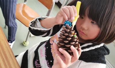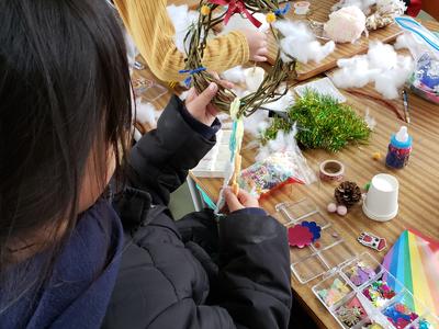 キラキラする飾りやふわふわの綿、子どもたちにとってはどれも宝物です!巻き付けたり貼り付けたり、友だち同士で助け合ったりと思わずほほえんでしまう素敵な姿も見せてくれました!