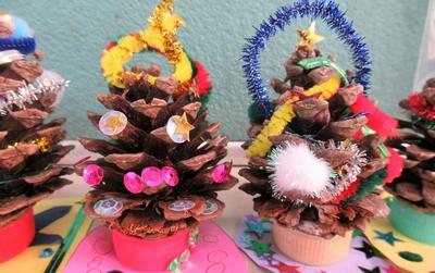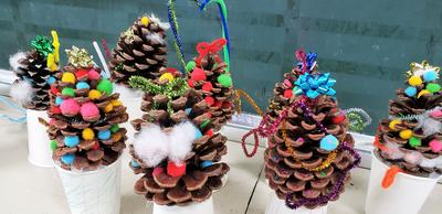 12/9(月)、昼休みに一年生の教室をのぞくと素敵な季節の飾りが迎えてくれました。小さな小さなクリスマスツリーです!子どもたちが集めた松ぼっくりにきれいな飾りをつけて作られた小さな小さなクリスマスツリーです!その松ぼっくりのツリーを支えているのは、色鮮やかなペットボトルキャップです!そのかわいらしこと愛おしいこと!思わず手にとって、手のひらに乗せてみました。
