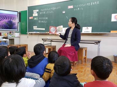 写真は、本日(12/10)2年生の英語の授業の様子です。世界の行事、今回はクリスマスについて知ることができました。英語支援の夏井先生より、アメリカの家庭のクリスマスの様子を話していただいたり!写真を電子黒板に映し出して説明していただいたり!読み聞かせをしていただいたり!クリスマスの歌も教えていただいて楽しいことが盛りだくさんの素敵な時間を過ごすことができました。中でも子どもたちを驚かせたことは、クリスマスには、一つではなくたくさんのプレゼントが贈られることでした!