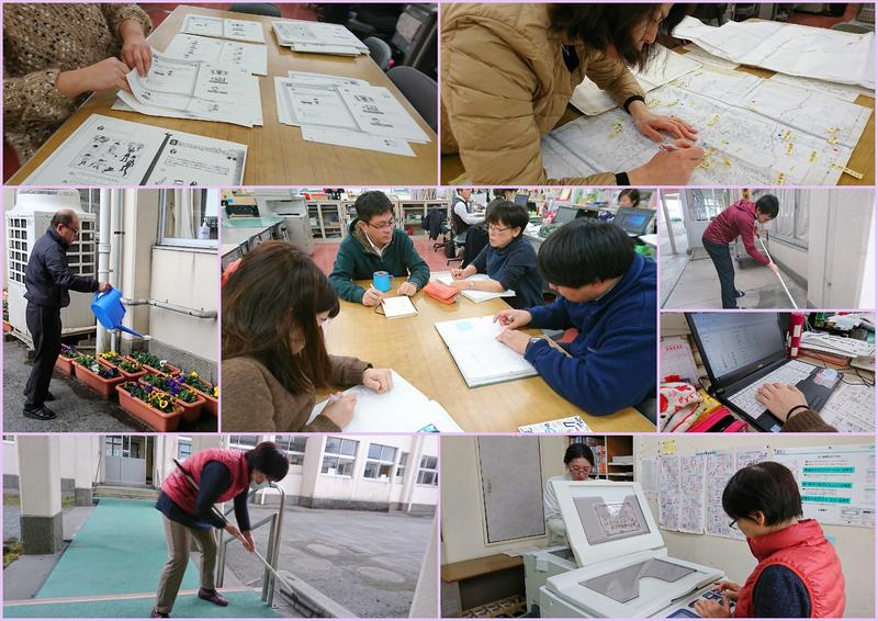(先生方は冬休み最後の日をどんなふうに過ごしているのかな?)少し慌ただしそうです!!教室を再点検して修繕個所を直したり、掃除をしたり。学習プリントを印刷したり製本したり。6年部の先生方は、卒業式までのスケジュールを細かに確認中です!!新しく入学する1年生の体験入学に向けて準備を進められている先生方の姿もあります。これからの子どもたちとの大切な時間を有意義に、有効に過ごすことできるようにと、みんなで協力して冬休み最終日を過ごしています。