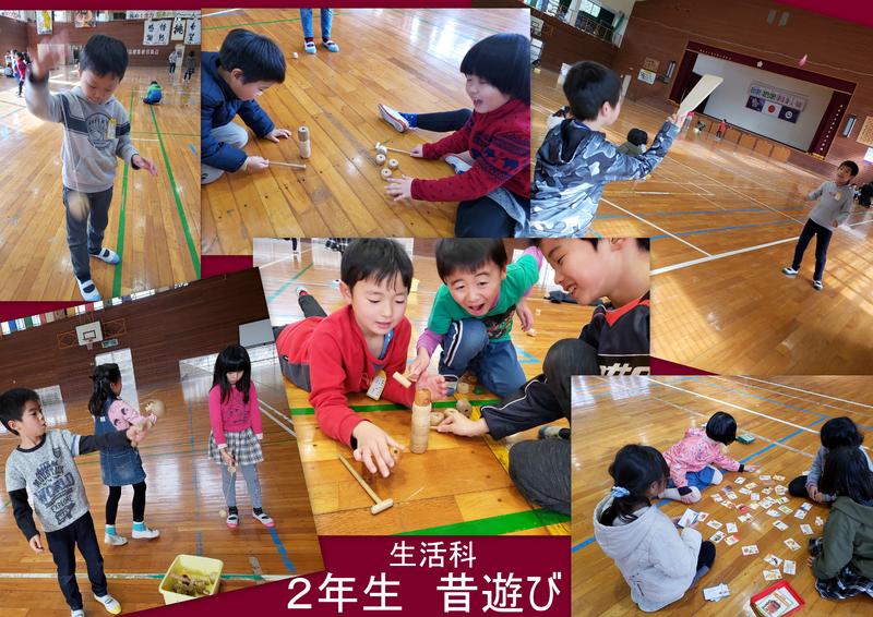 さて、2年生の子どもたちは、冬休み明け初日(1/8)の生活の時間に昔遊びを楽しんだようです。昨年度は、地域の方々に遊び方やうまくできるコツを教わった子どもたちは、さすが!!今年は、自分でコマにひもをまくこともできたとか!!笑顔があふれた素敵な時間だったようです!!