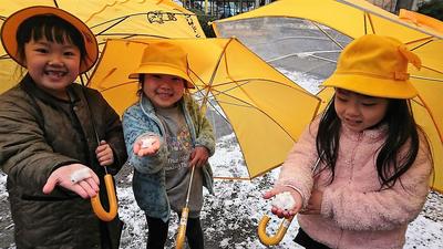 そして迎えた昼休み、水分の多かった雪のため、残念そうに教室で過ごす子どもたちが多い中、1年生の子どもたちは、黄色い傘に黄色い帽子をかぶって元気いっぱいに外へ飛び出していました!雪を見せようと手の平に乗せて届けてくれたかわいらしい姿をご覧ください!
