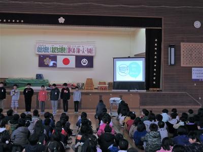 1/21(火)朝の児童集会では、栄養いっぱい給食委員会からの発表がありました。今回の発表では、校内給食週間に併せて、全国学校給食週間(1/24~30)について、クイズを交えながら知らせることで、給食の歴史について伝えるものでした。委員会の子どもたちから、「給食をいただくことができることに感謝し、おいしくいただきましょう。」と、全校児童へ呼びかけると、子どもたちからは大きな返事を聞くことができました。