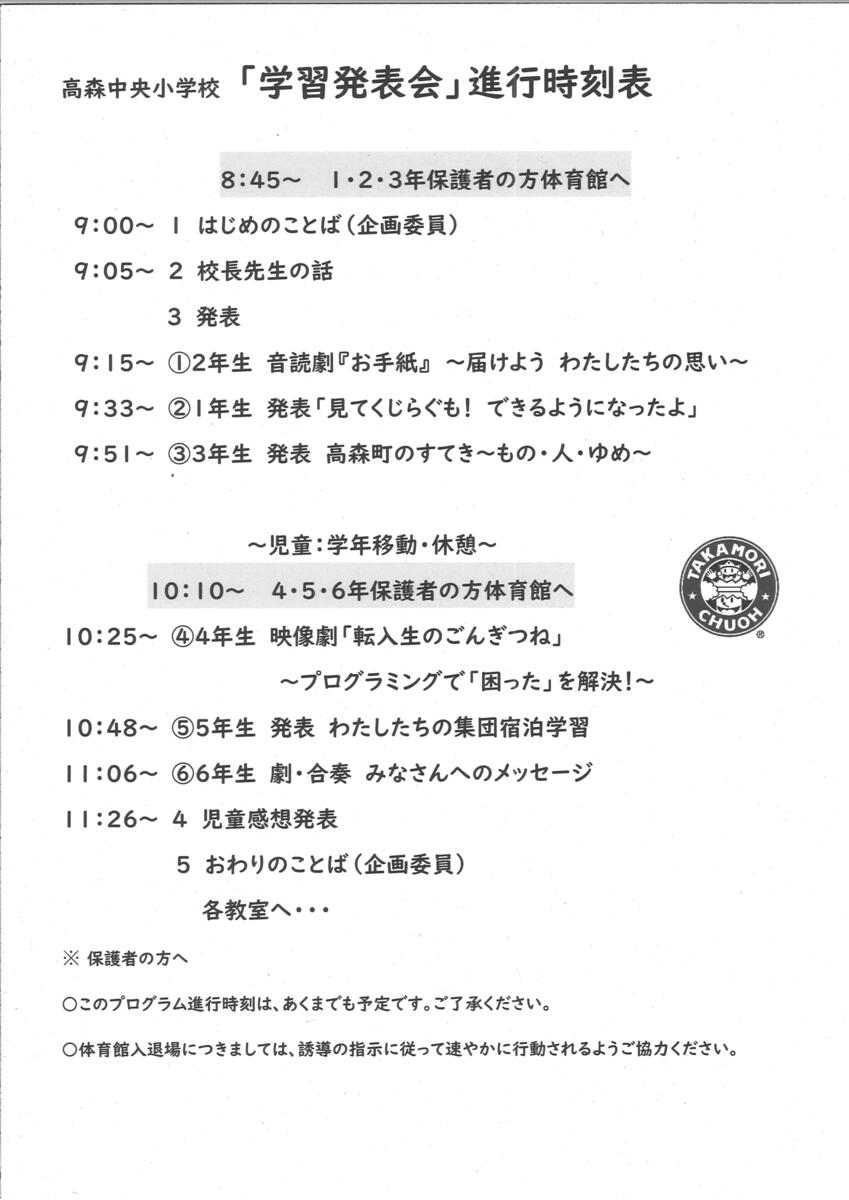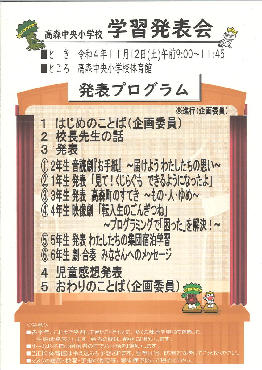 令和4年度 高森中央小学校 学習発表会を開催いたします!今年度は、低学年の部と高学年の部の2部構成で開催いたします。寒さ対策・感染症予防対策をされて、お越しください。お待ちしております。