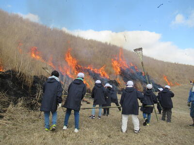 2/21(火)町古閑牧野にて、阿蘇青少年交流の家のスタッフの方や、野焼きボランティアの方のご指導のもと、4年生が野焼き体験を行いました。