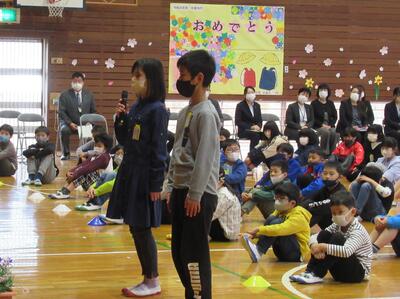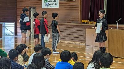 写真は、12/24(金)に行った、冬休み前集会の様子です。冬休みを前に、各学年の代表が、1学期前半にがんばったことと冬休みに取り組みたいことを発表しました。持久走大会で走り抜いたこと、自主学習をくふうしたこと、給食がたくさん食べられるようになったこと等、一人一人の思いが詰まった発表になりました。また、冬休みには、たくさんの楽しみがあることも伝わってきました。