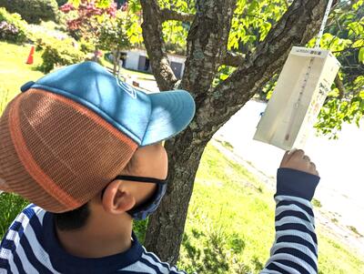 写真は、4年生の子どもたちが、晴れの日の一日の気温の変化を観察する様子です。休み時間ごとに桜の木の下に集まって、真剣に気温を計っています。グループごとに担当の時刻を決めて取り組む様子に感心します!「理科の時間が楽しみです!」「今年から始めて理科室で勉強できてうれしいです!」子どもたちが理科の時間を大好きな様子が伝わってきます。